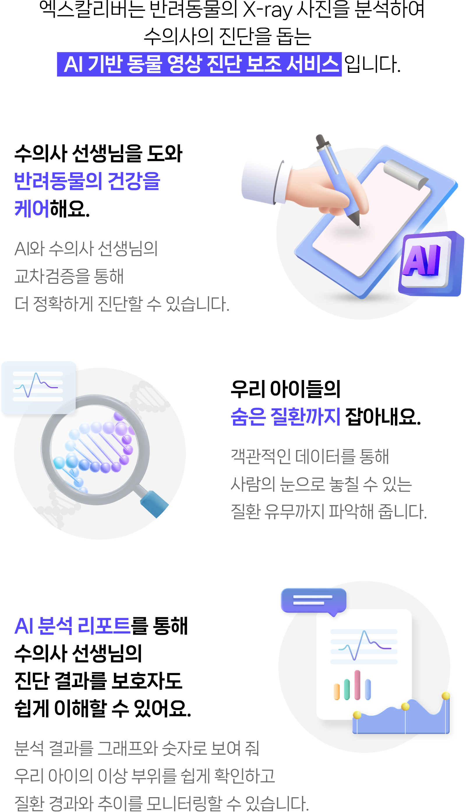 엑스칼리버는 반려동물의 X-ray 사진을 분석하여 수의사의 진단을 돕는 AI 기반 동물 영상 진단 보조 서비스 입니다.